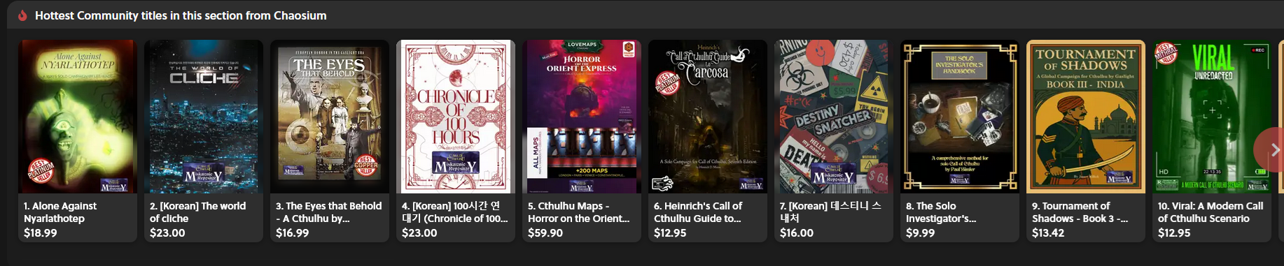 While Chaosium publishes their own scenarios, there are also third-party publishers creating content for the game. At present, Chaosium allows anyone to publish scenarios for Call of Cthulhu (CoC), through the Miskatonic Repository (MR) on drivethrurpg.com.