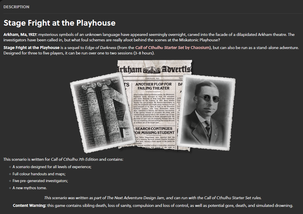 Unlike fantasy roleplaying games, where generally the game master is expected to do a large portion of the world-building themselves, investigative roleplaying games have a long history of published scenarios.These are generally, short, contained mysteries with a textbook style breakdown of the investigation, as well as some helpful handouts that the Keeper can read and use in order to run the investigation.